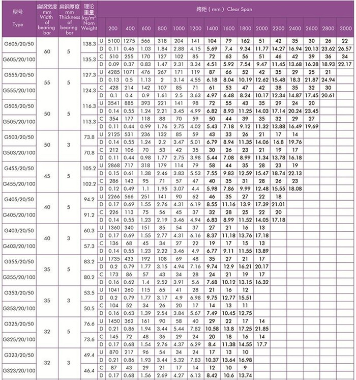 平面型扁鋼中心距為20常用鋼格板規(guī)格型號及安全荷載表