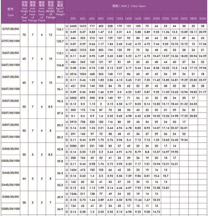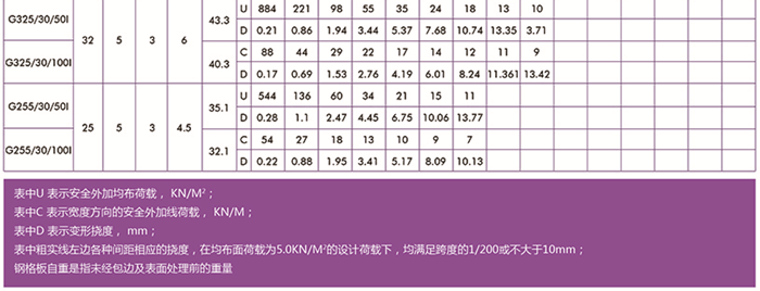 工字型扁鋼中心距為30常用格柵板規(guī)格型號及安全荷載表